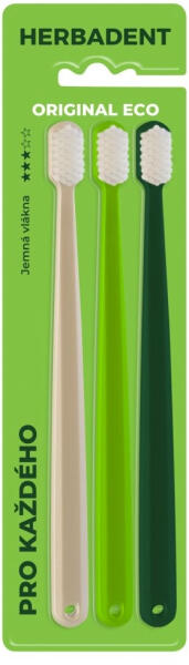 Periuța de dinți cu peri moi este fabricată din plastic de paie de orez. Periuțele de dinți Herbadent Original Eco sunt dezvoltate în colaborare cu medici stomatologi și igieniști dentari cehi și îndeplinesc cerințele îngrijirii dentare moderne. Sunt echipate cu fibre de nailon foarte fine, cu tăietură dreaptă. În combinație cu un cap de periuță mic, le permit să se adapteze perfect la suprafața dintelui și să curețe chiar și locurile greu accesibile. Sunt foarte blânde cu gingiile sensibile, predispuse la sângerări sau boli parodontale. Avantaje: fabricat din materiale ecologice, fibre de nailon tăiate drept, gât de perie subțire și relativ flexibil pentru controlul presiunii, cap mic pentru curățarea ușoară a locurilor greu accesibile, fibrele fine nu irită gingiile sensibile, pachet avantajos de trei, Matire selectivă a suprafeței pentru o prindere sigură și o senzație fină în gură. Pachetul conține 3 pensule. Dozaj și metodă de utilizare Așezați periuța de dinți la un unghi de 45 de grade față de gingii și folosiți mișcări circulare și vibratoare pentru a îndepărta murdăria și placa bacteriană de la rădăcină până la coroana dintelui și de pe suprafețele de mestecat ale molarilor.